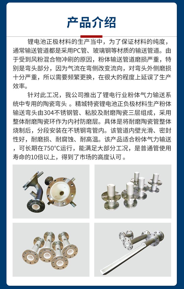锂电池行业耐磨陶瓷进料管精城增压管抗压性强
