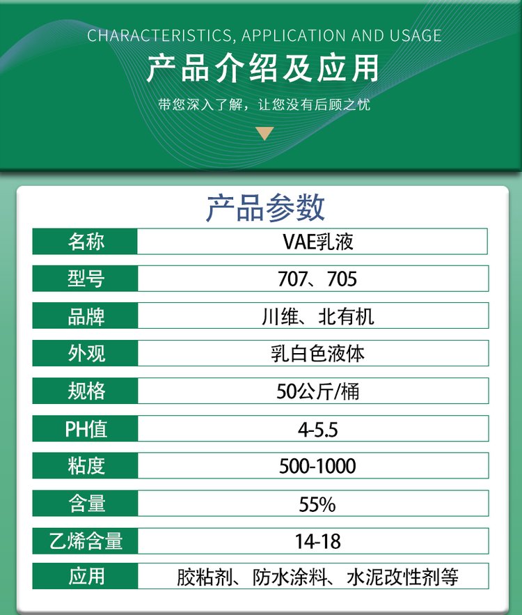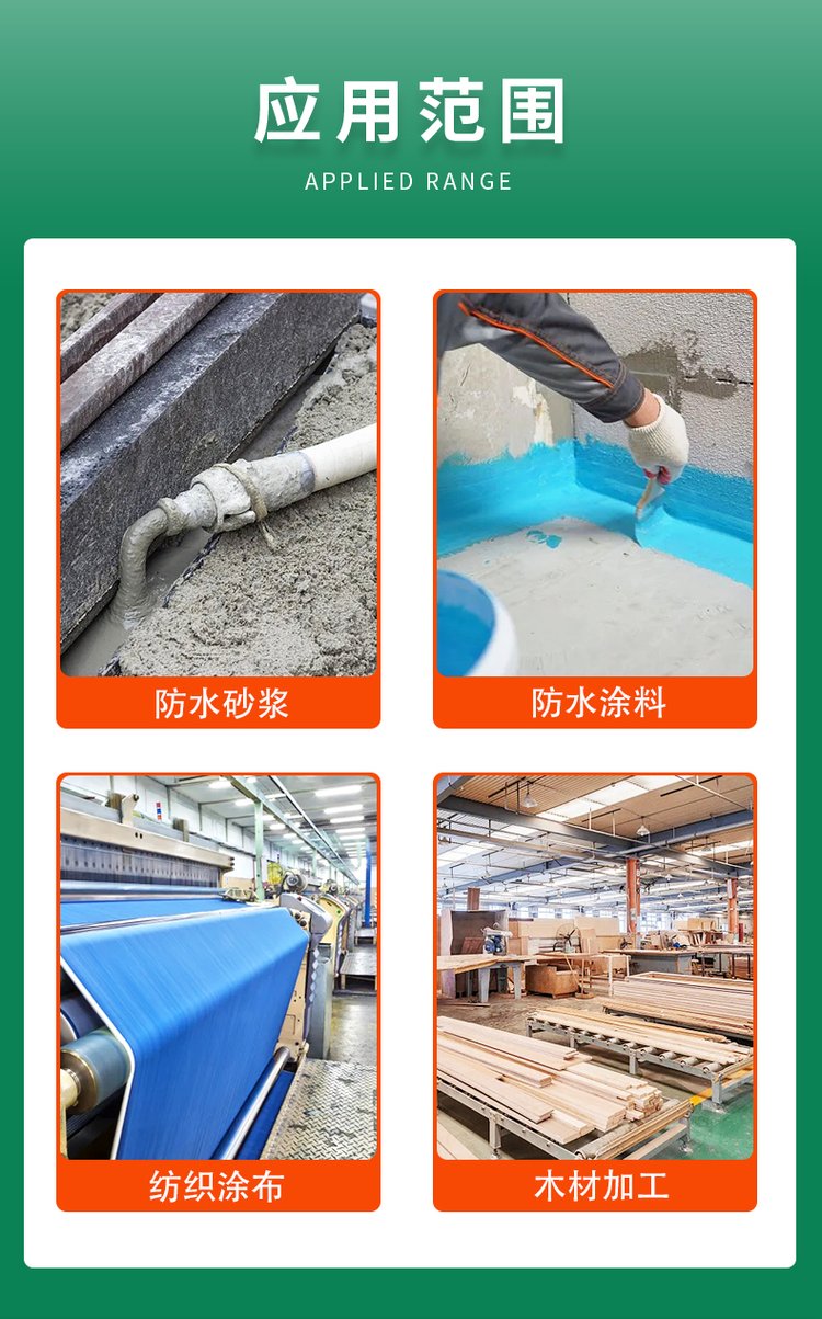 用途范围 | 用于胶粘剂的基料:粘接木材、皮革、织物、纸张、水泥、混凝土、铝箔、镀锌钢板等材料 | ||
