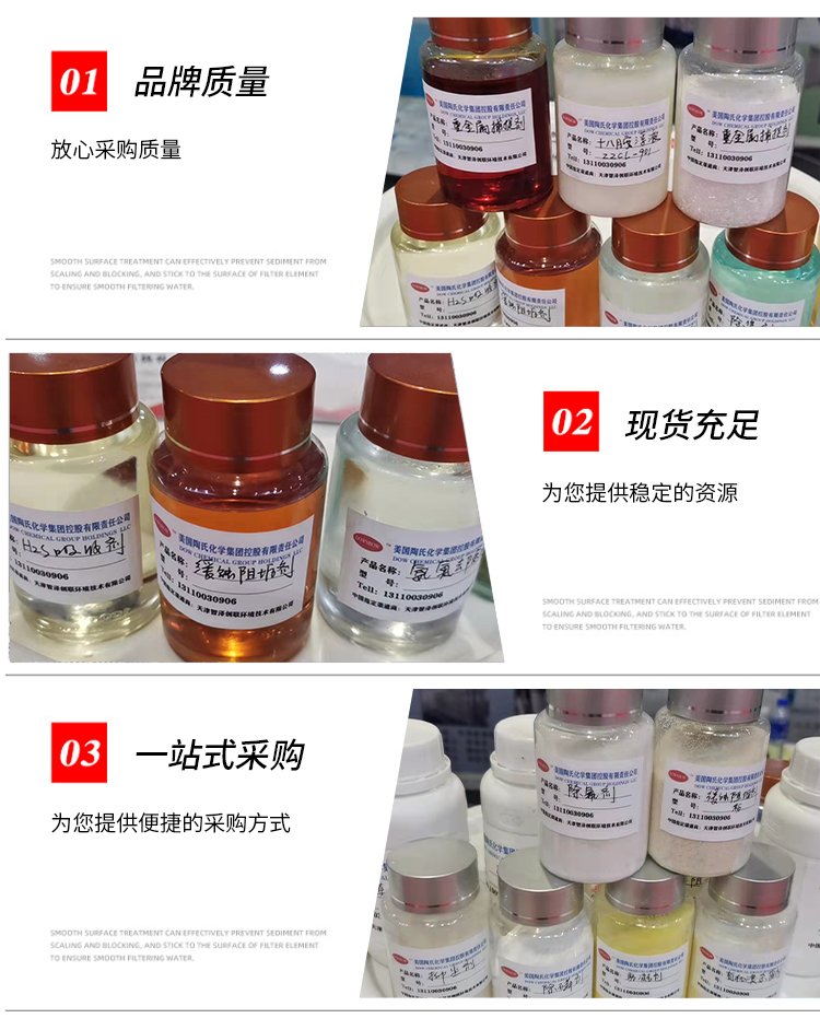 主营产品:陶氏树脂、纤维粉、陶氏阻垢剂、杀菌剂、陶氏超滤膜、陶氏反渗透膜、陶氏大流量滤芯、氨氮去除剂、十八胺停炉保护剂、均三嗪杀菌剂、卡松杀菌剂、异噻杀菌剂、抑尘剂、脱硫增效剂、重金属捕捉剂、消泡剂、除磷剂、除氧剂、锅炉水处理剂、锅炉水阻垢剂、锅炉水稳定剂、黄烟去除剂、氮氧化物去除剂、脱硝剂