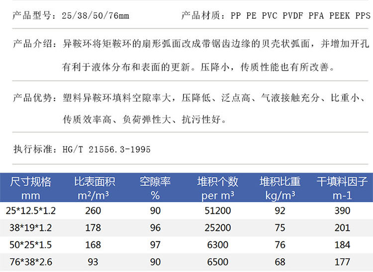 塑料PP异鞍环 吸收塔废气塔填料 PVC/CPVC/PVDF材质 DN25/38/50 密度 | 0.92g/m3 | ||