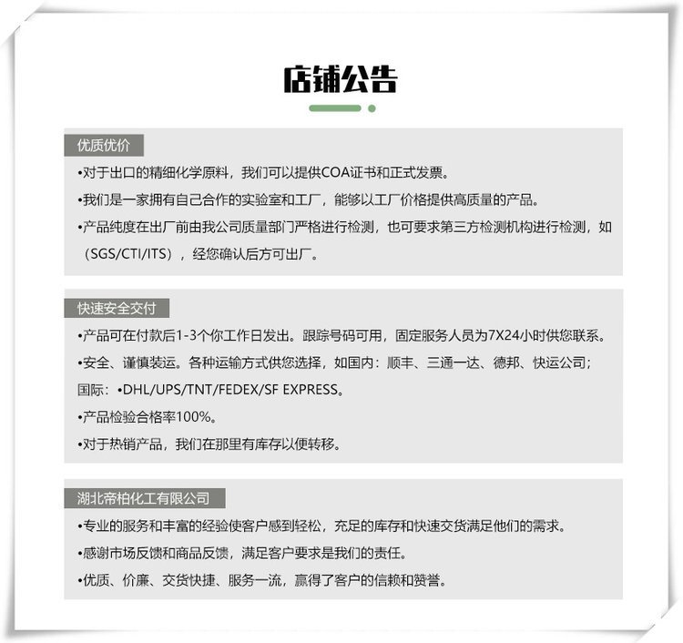 帝柏化工提示:我公司仅提供常规原料产品;合作对象:公司、单位,不对个人销售!