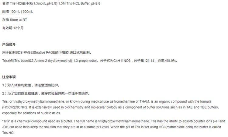 Tris-HCl缓冲液 1-1.5mol/L pH6.8-8.8 500ml/瓶 学校实验用 品牌 | TrisHCl | ||