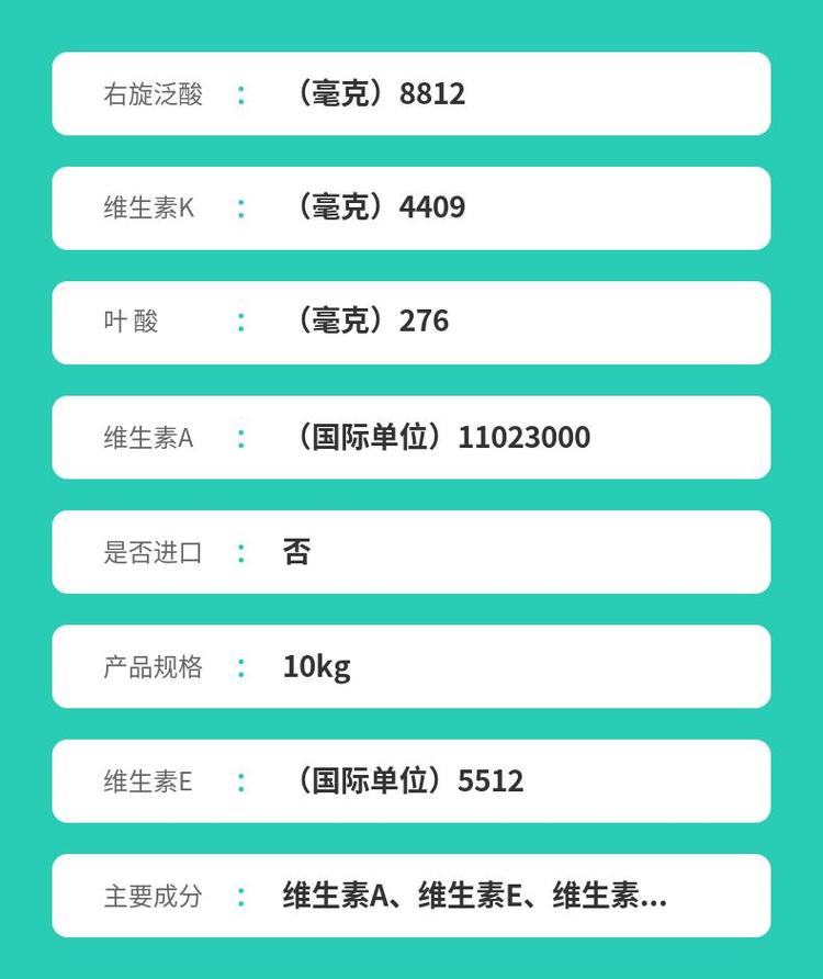 主要成分 | 维生素A、维生素E、维生素D3、维生素K3等;载体 | 无水葡萄糖 | |