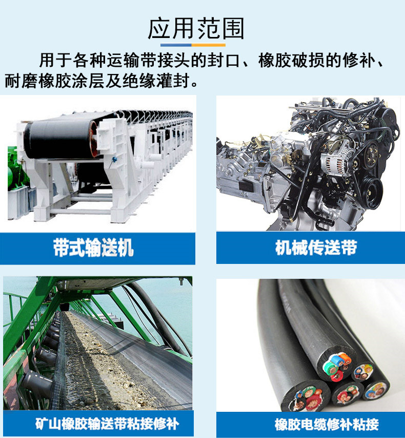 用途范围 | 用于各种输送带粘接接头的封口及破损的修补。 | ||