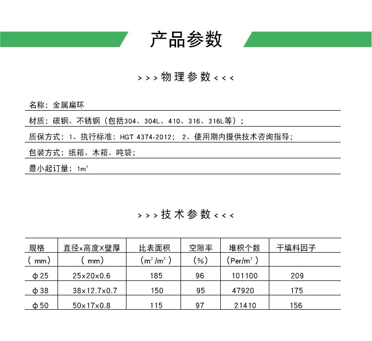 金属扁环填料广泛应用于石油化工、化肥、环保等行业等填料塔中。金属散堆填料的材质可有多种,如碳钢、不锈钢304、304L、410、316、316L等。