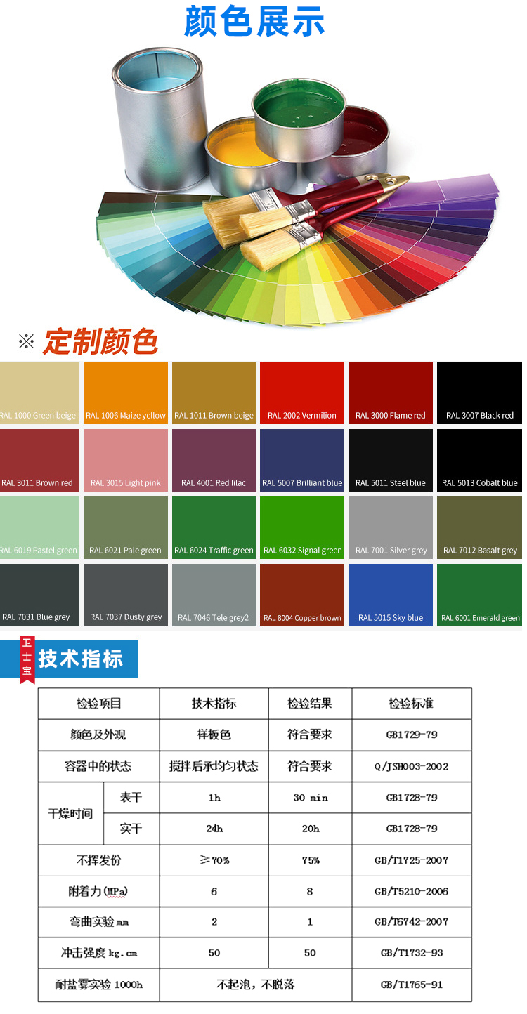 用途范围 | 可作为环氧富锌底漆、无机锌底漆等高性能防锈漆的中间层漆 | ||