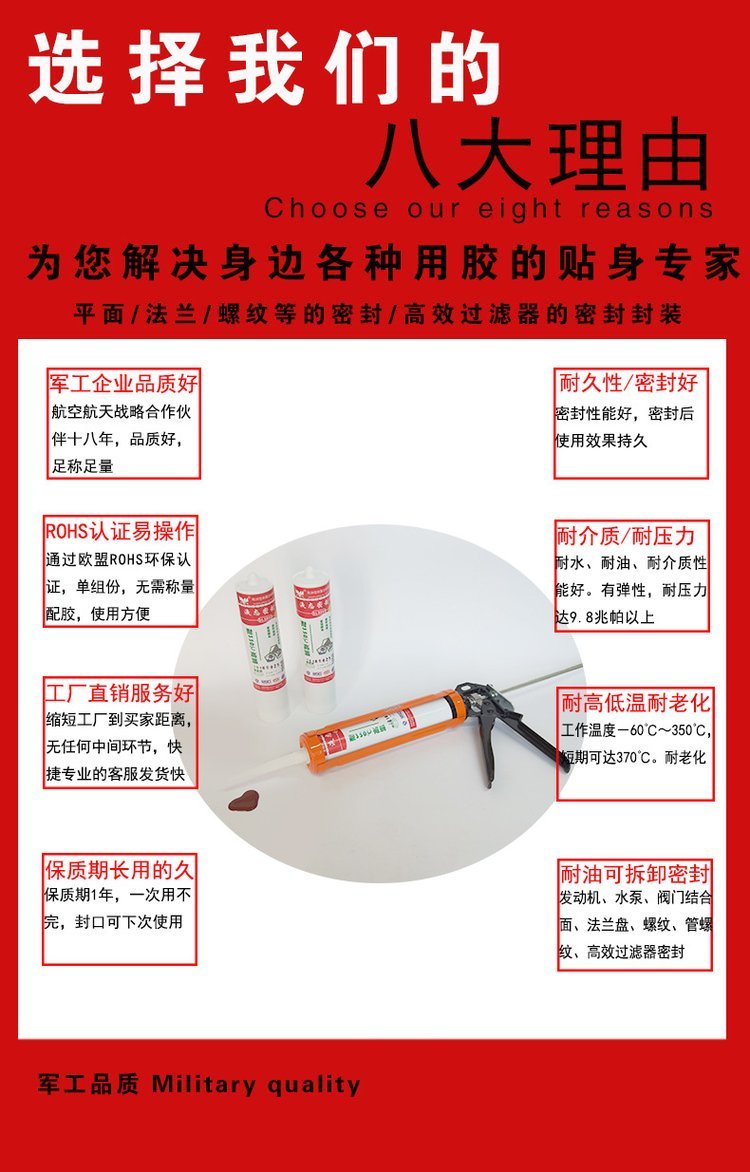 适用于汽车、摩托车等发动机、水泵、阀门等有关结合面或法兰盘的可拆卸的密封,也可用于可拆卸的螺纹密封及管螺纹的密封。也适合用于温度在 250℃~300℃的高效过滤器的密封和封装,可固定电线、金属等。