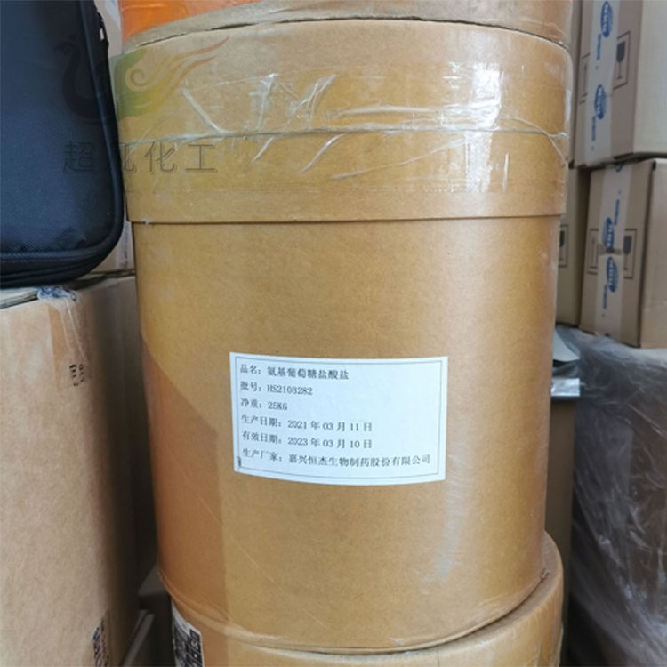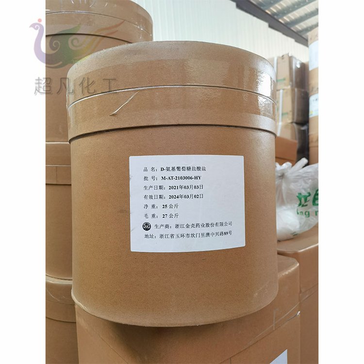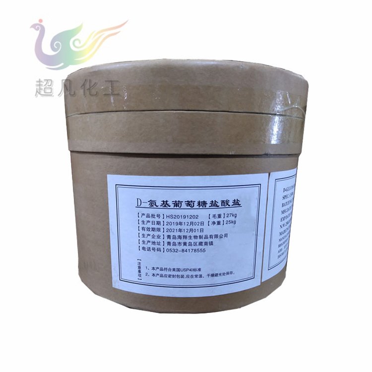 【产品包装】葡萄糖胺盐酸盐内用两层聚乙烯塑料袋,外用纸板圆桶包装。净含量25kg。