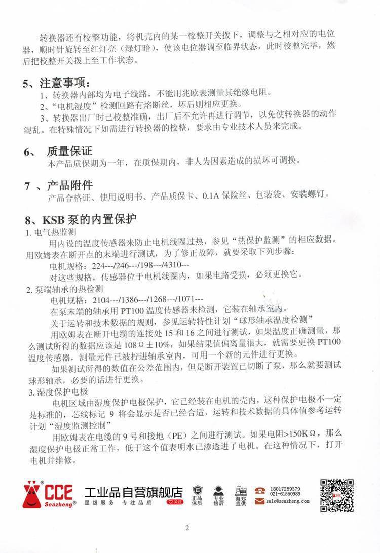 转换器具有电机绕组温度监测保护、电机、泵轴承温度监测保护、电机湿度监测保护及机械密封监测保护功能。