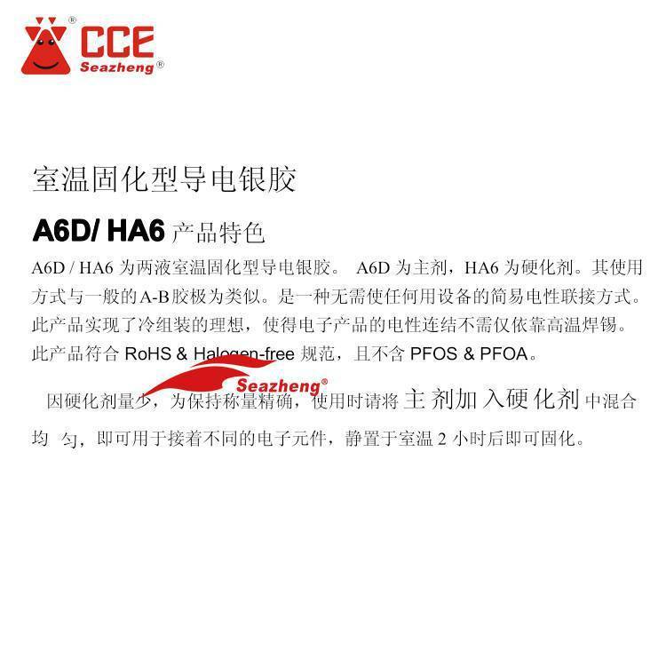 A6D / HA6 为两液室温固化型导电银胶。 A6D 为主剂,HA6 为硬化剂。其使用