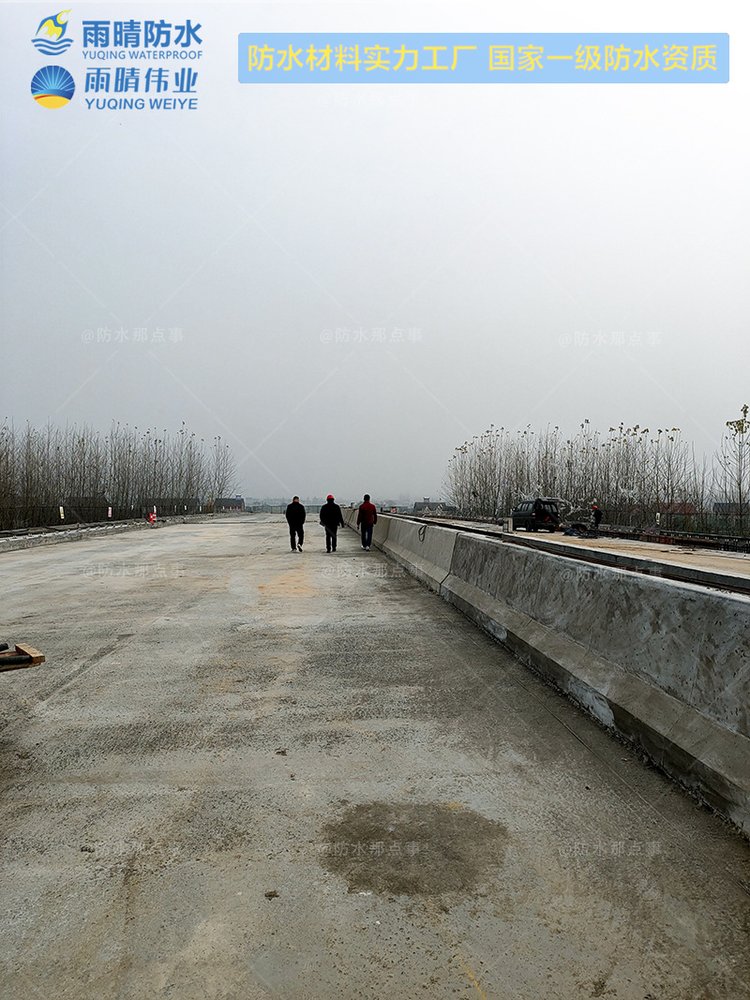 (2)待防水涂料干燥后,在沥青层铺装前要严格进行保护,严防钉子、钢筋、车辆、行人等人为破坏防水层,并设置专人保护;验收合格的防水层,一般禁止载重汽车通行,必须行驶的车辆在5—8小时(不低于25摄氏度气温)以后行驶,并保证车速低于5km/h,不得紧急刹车和调头,防止防水层破坏。
