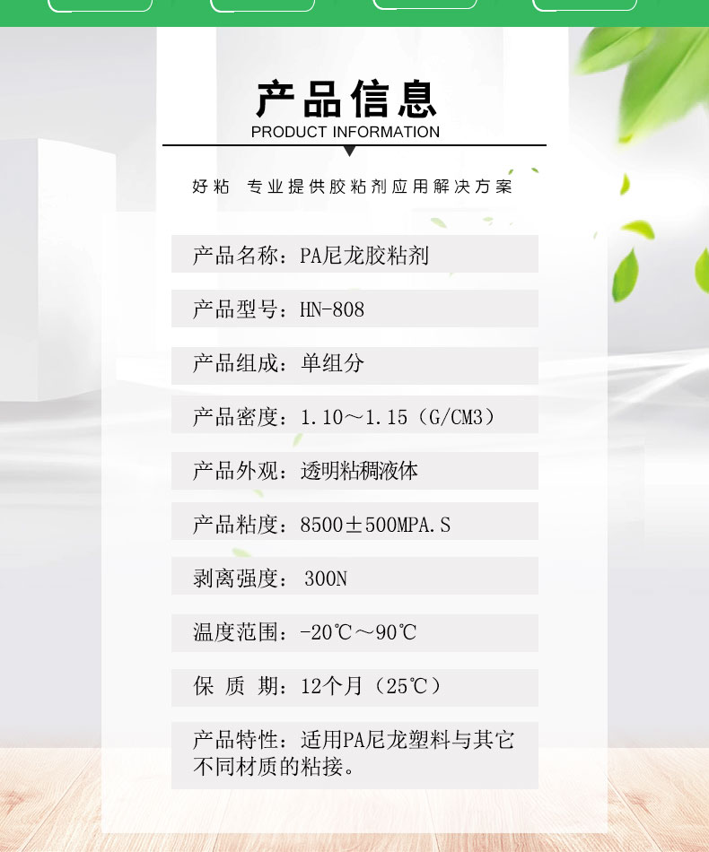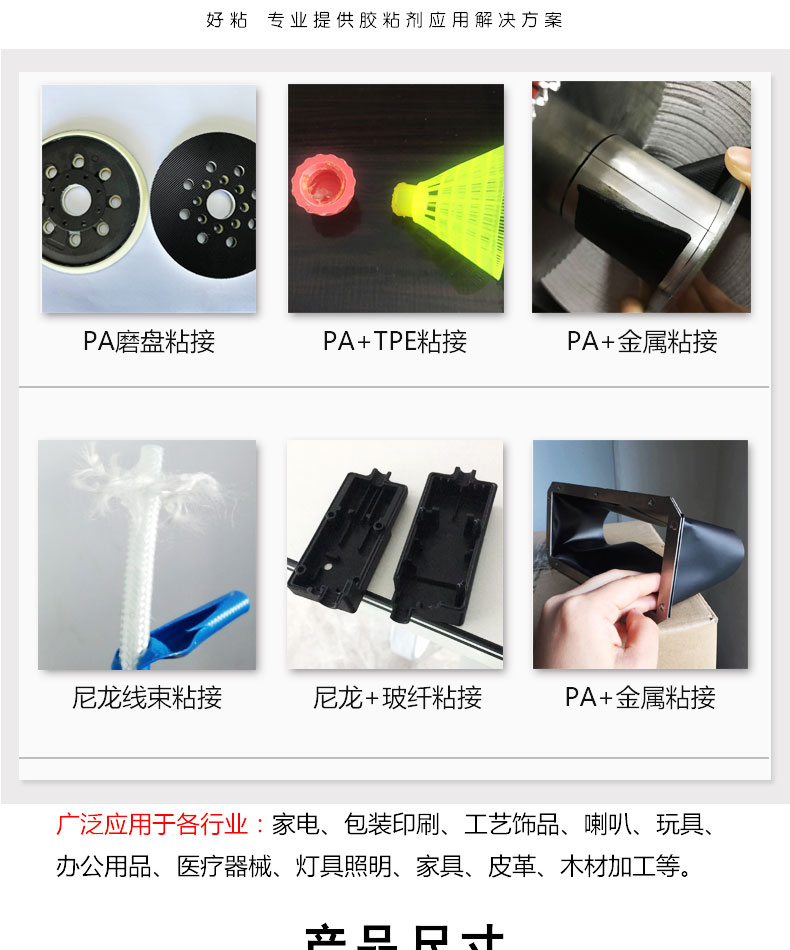 应用领域 | 尼龙与尼龙、皮革、玻璃、瓷器、木头、TPU等材料的粘接 | ||