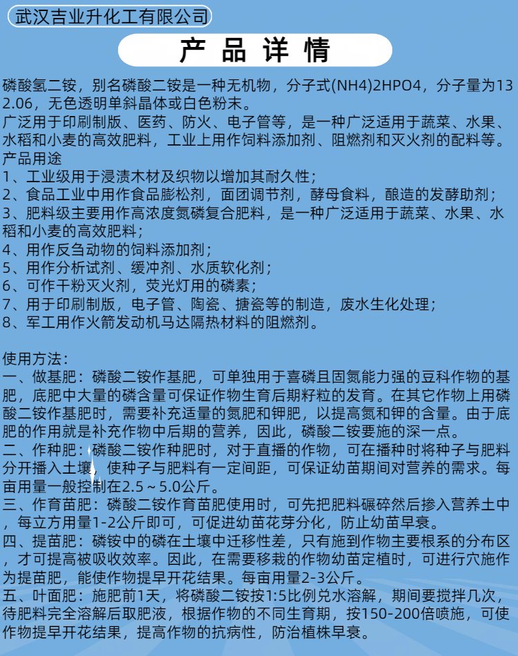 用途范围 | 磷酸二铵是一种高浓度的速效肥料。适用于各种作物和土壤。特别适用于喜氮需磷的作物。作基肥或追肥均可,宜深施。 | ||