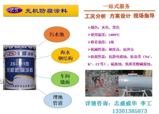 ? ? ? ZS-711无机聚合物防腐涂料是为满足航天、军工等领域的特殊要求而研发的高科技产品,产品已经在航天、军工领域成功应用并逐步推广到国民经济各行业。现在这种新型的无机聚合物防腐涂料已成为保护钢铁普遍、重要的涂料。ZS-711无机聚合物防腐涂料在大气、地下、海洋、石油液体、化工材料、污水、交通中等重要防腐领域应用几乎没有可与之媲美的产品相比较。