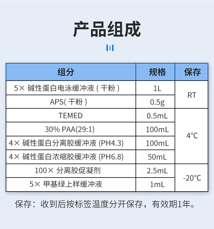 产品名称 | 碱性蛋白Native-PAGE胶制备及电泳试剂盒 | ||