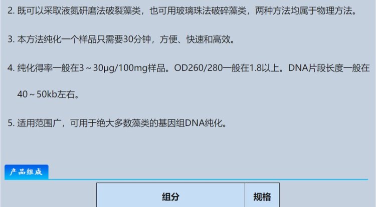 用途范围 | 用于藻类基因组DNA的快速提取纯化 | ||