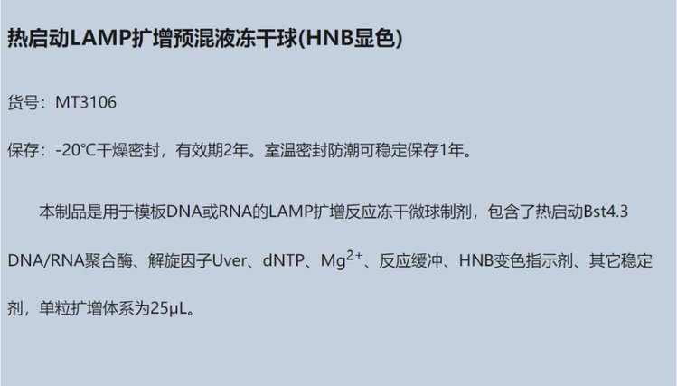 产品名称 | 热启动LAMP扩增预混液冻干球(HNB显色) | ||