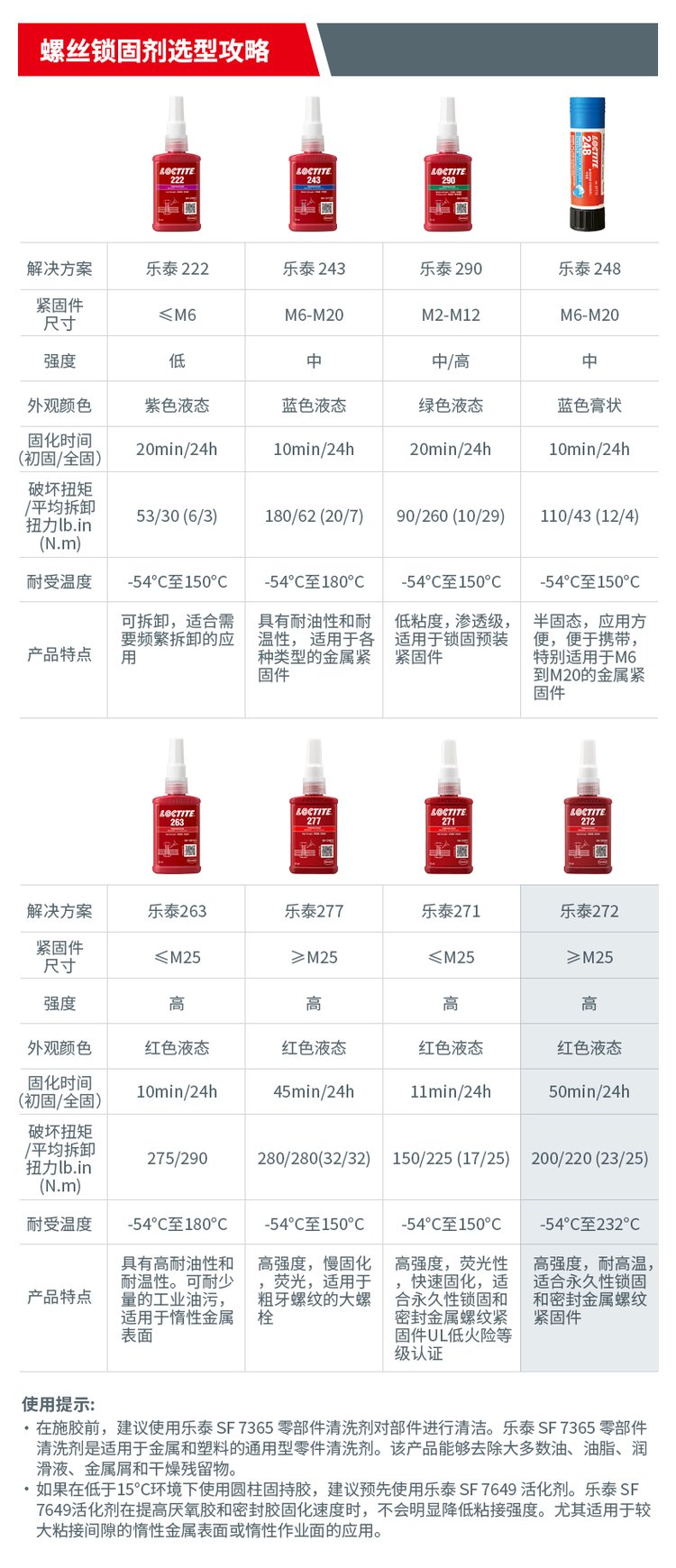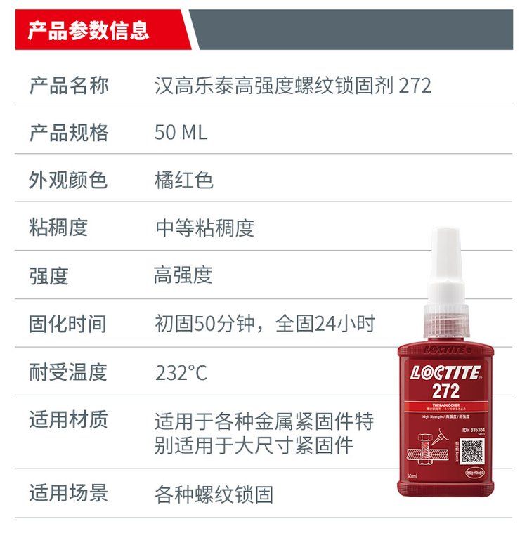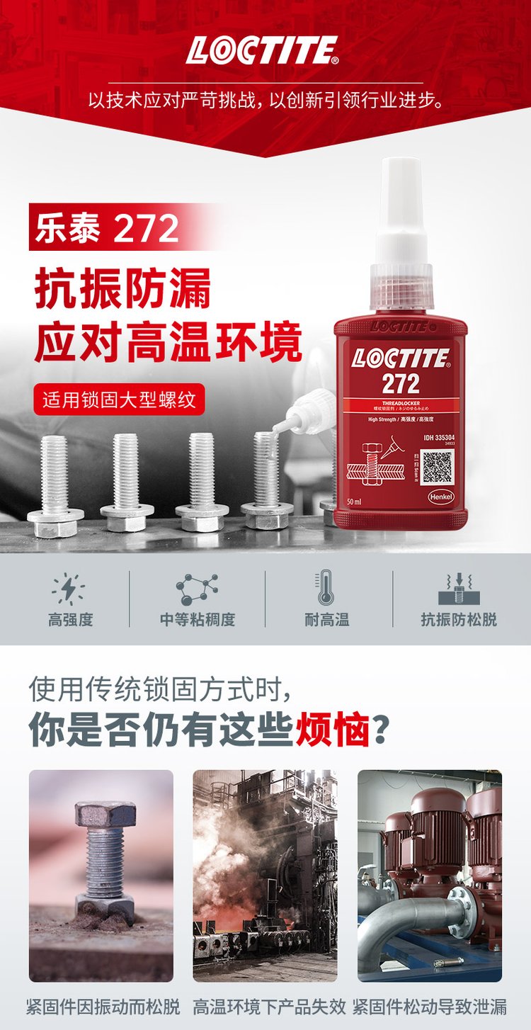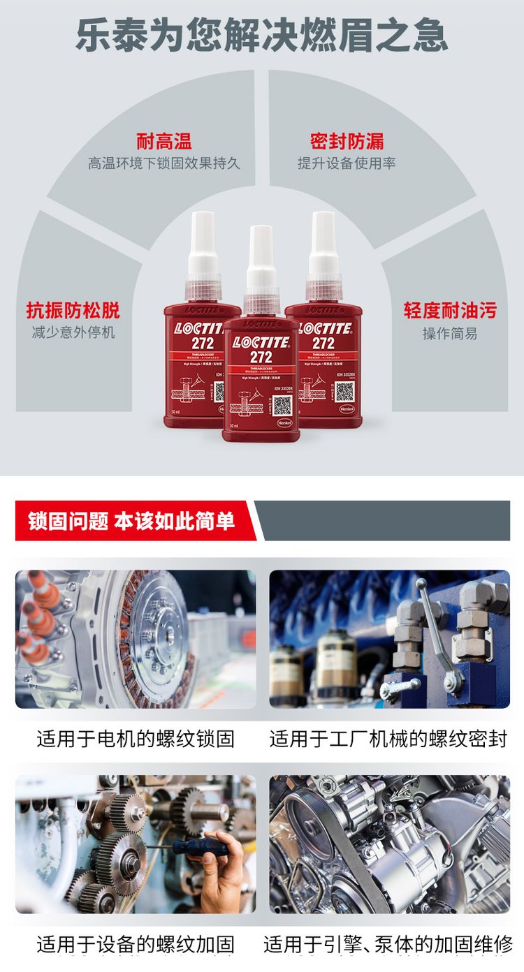 正品乐泰272螺纹锁固剂耐高温易操作适配大尺寸螺栓可搭配促进剂50ml