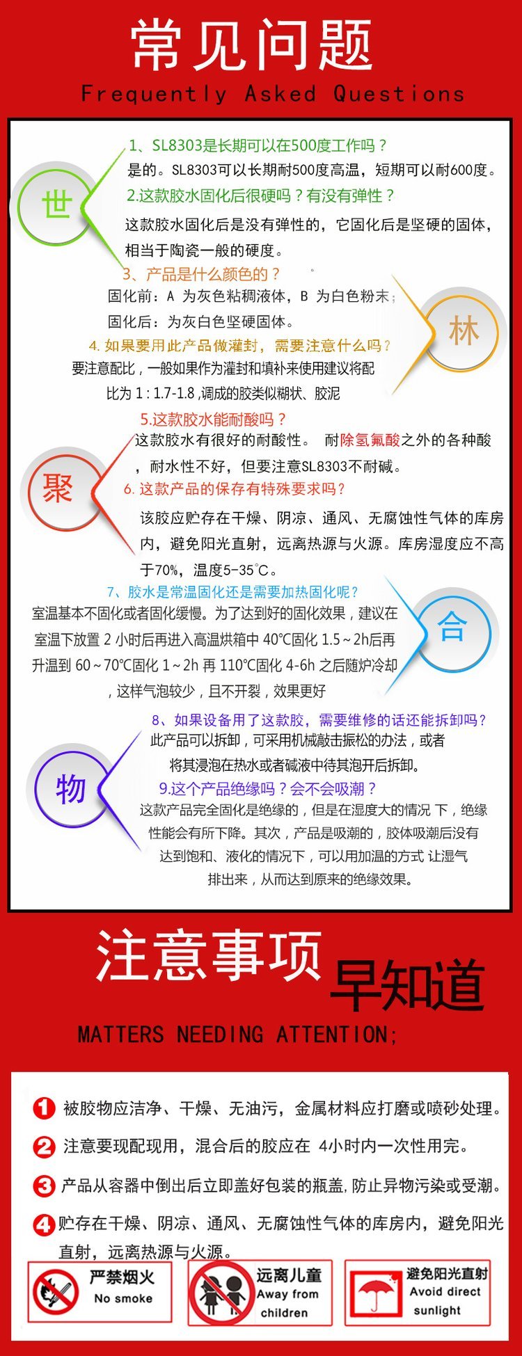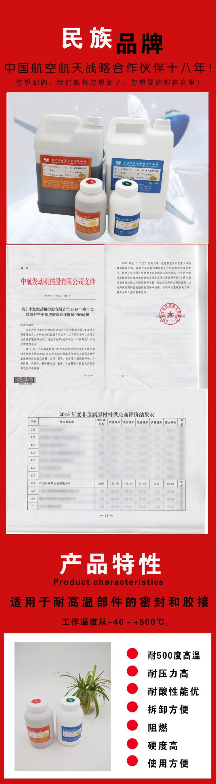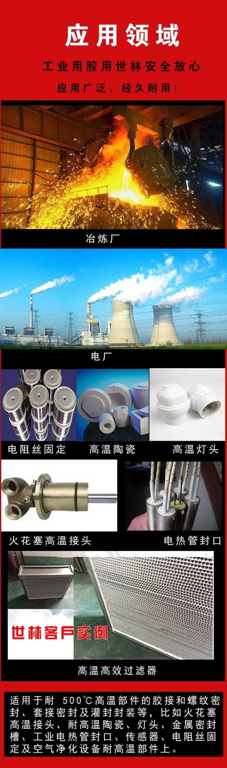 适用于耐 500℃高温部件的胶接和螺纹密封、套接密封及灌封封装等,比如火花塞高温接头、耐高温陶瓷、灯头、金属密封槽、工业电热管封口、传感器、电阻丝固定及空气净化设备耐高温部件上。