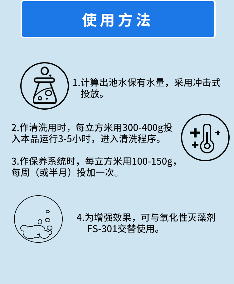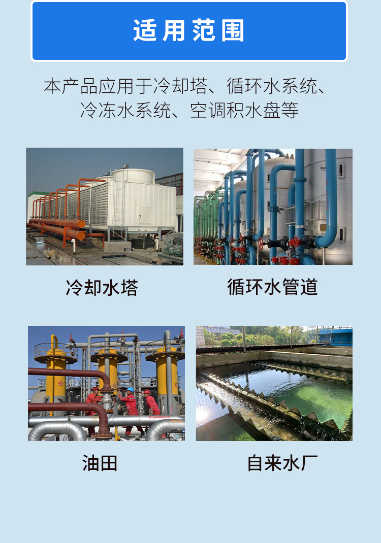 用途范围 | 中央空调、冷却塔循环水清洗 | ||