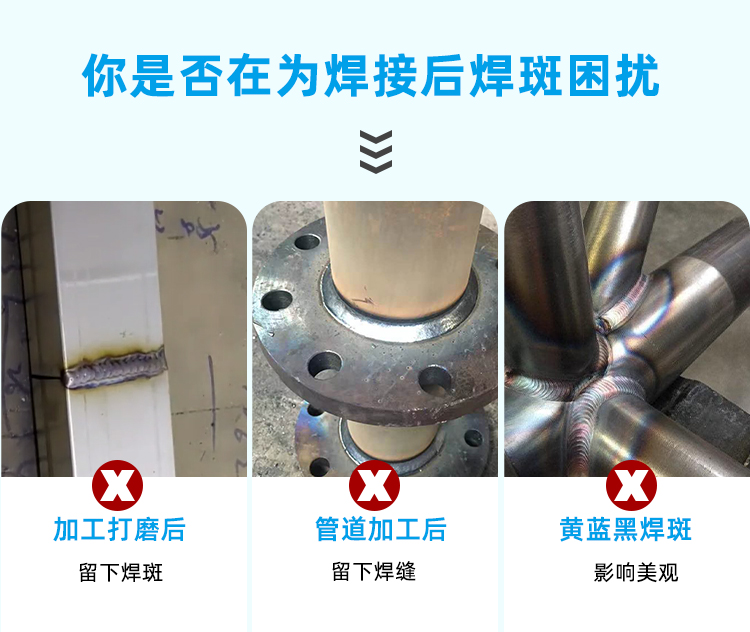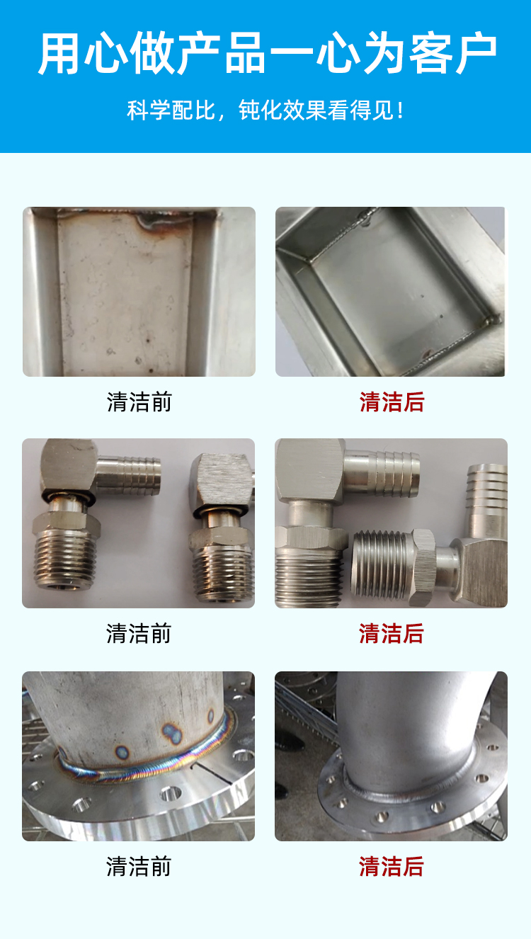 产品特性 | 除不锈钢表面的锈.氧化皮.焊接后产生的黄蓝黑色焊斑等污物 | ||