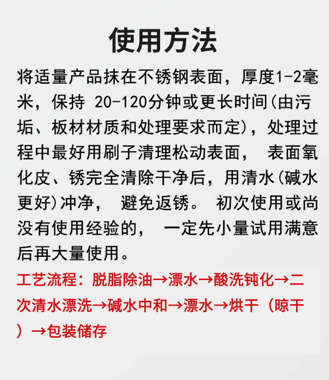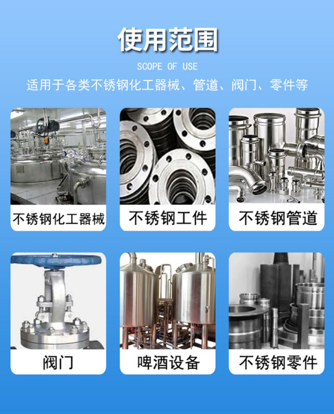 用途范围 | 适用于304及以上型号的不锈钢食品机械,化工器械印染 设备、石化设备等不锈钢制品;对于200系列不锈钢,同样适用,酸洗时间相对较短 | ||