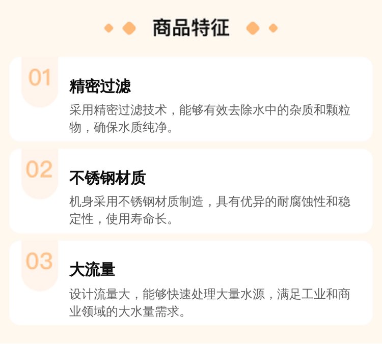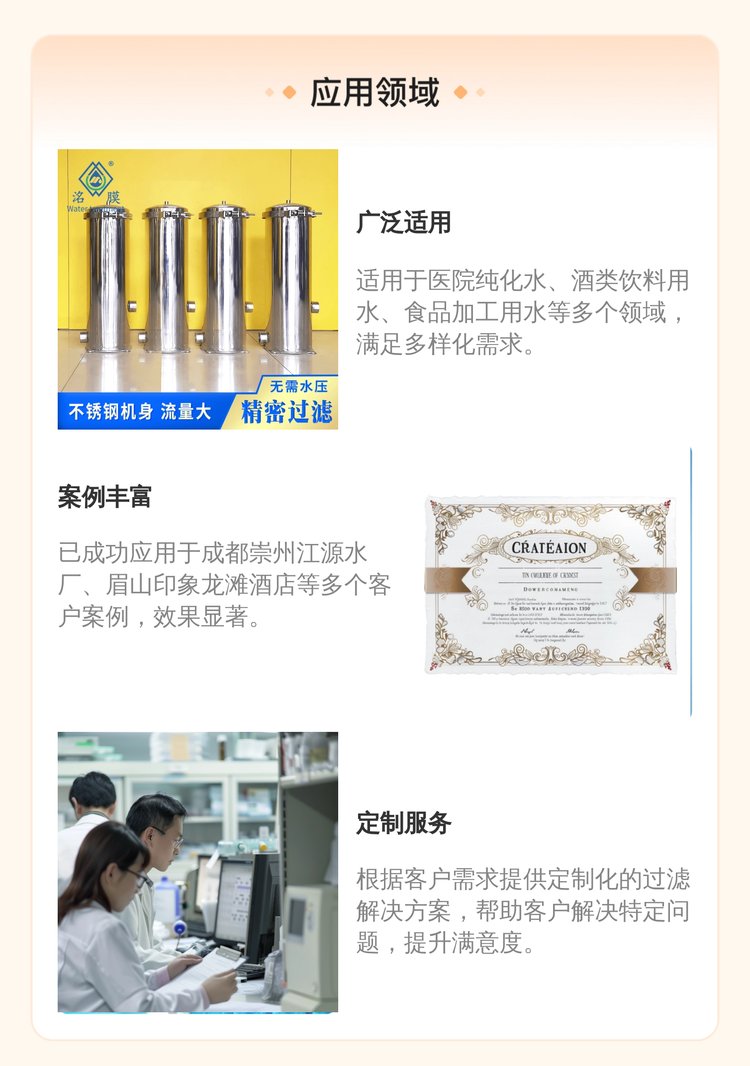 应用领域 | 医院用水、酒类饮料用水、食品加工用水、城市公共直饮水、精细化工用水、企事业单位直饮水、花卉用水、养殖用水、医药加工用水、化妆品生产用水、农村饮用水 | ||
