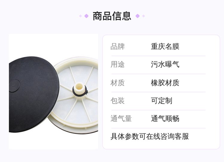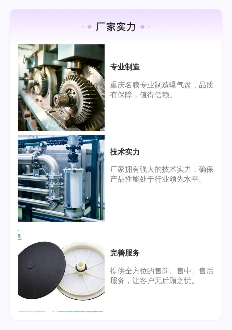 重庆名膜公司该曝气盘应用范围:1、工业城市污水曝气 ?2、活性污泥接触氧化法 ?3、调节式预曝气 ?4、老式曝气器更新改造 ?5、间歇式曝气