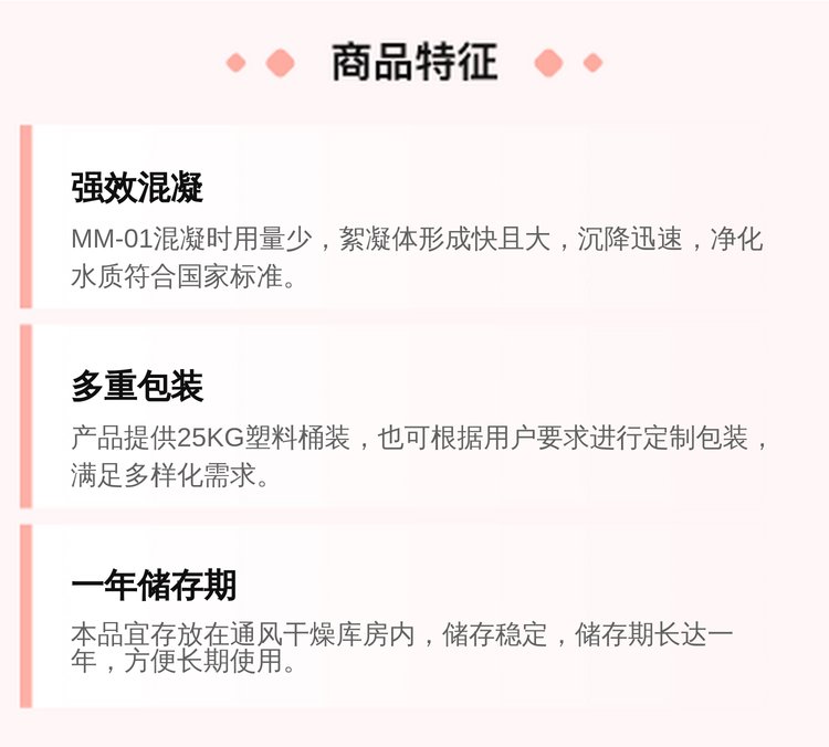 MM-01 絮凝剂是以铝盐为基础的复合净水剂。由铝系高分子与有机高分子型絮凝剂特殊复合复合而成。本品溶解快、无腐蚀性、净水能力强,对水质适应范围广、碱度耗量小,具有很好的除浊、脱色、除臭效果和除去某些有害物的效能,其效能为普通聚合氯化铝的3~5倍。混凝时用量少,絮凝体形成快而大,沉降迅速,净化后的水质符合国家颁布的生活饮用水卫生标准GN5749~85。?? ? ? ? ? ? ? ? ? ? ?