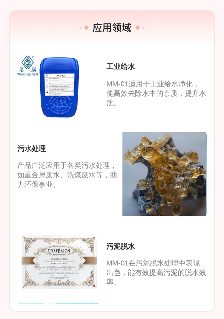 MM-01 絮凝剂能用于所有需要强混凝能力的方面,其广泛用于: