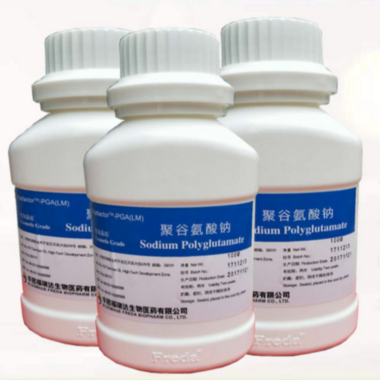 聚谷氨酸钠,是聚谷氨酸的谷氨酸单元体侧链的羧基电离形成阴离子羧酸根(COO-)后,与钠离子结合形成的产物。聚谷氨酸本身难溶于水,必须要离子化后才能与水相溶。聚谷氨酸钠水溶性极好,是天然保湿成分,现被广泛应用于化妆品保湿原料。