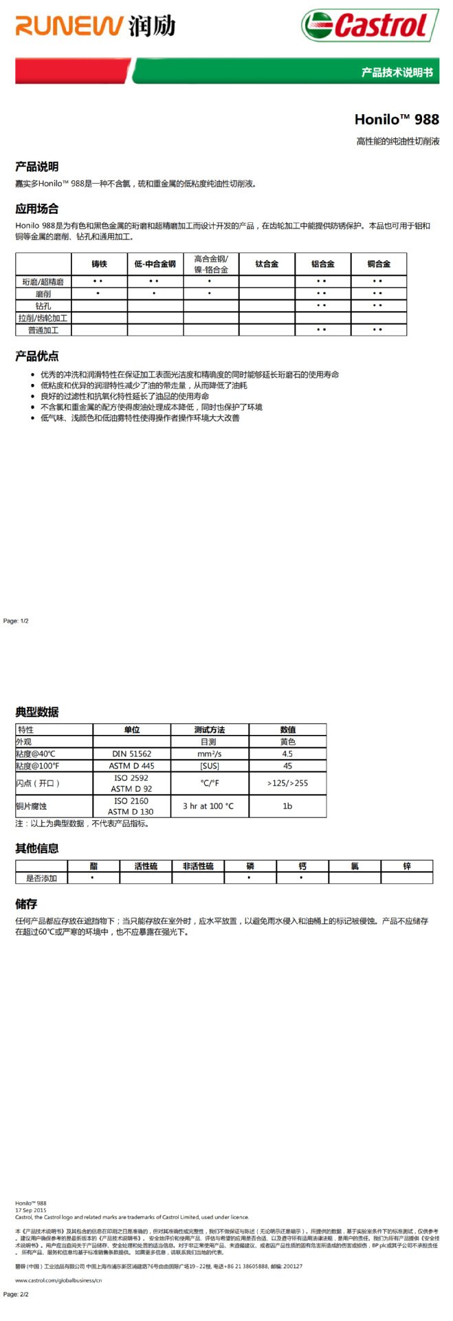 嘉实多CastrolHonilo988纯油性切削液金属珩磨超精磨加工液