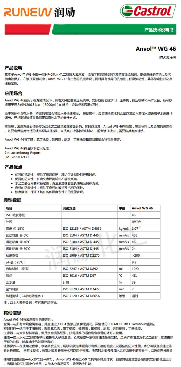 嘉实多CastrolAnvolWG46防火液压油水-乙二醇阻燃液压液