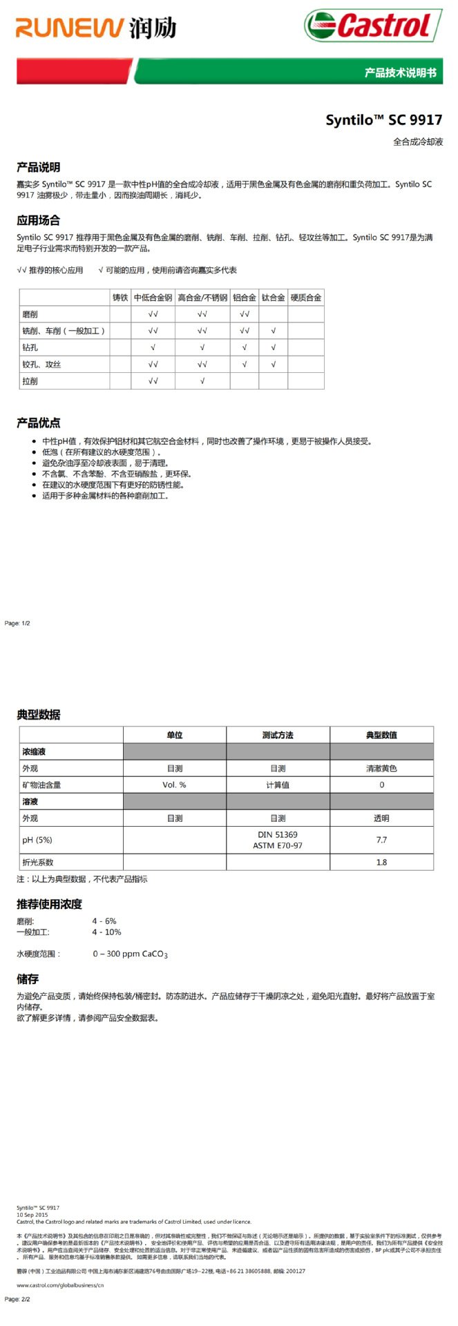 嘉实多CastrolSYNTILOSC9917全合成切削液黑色\/有色金属磨削
