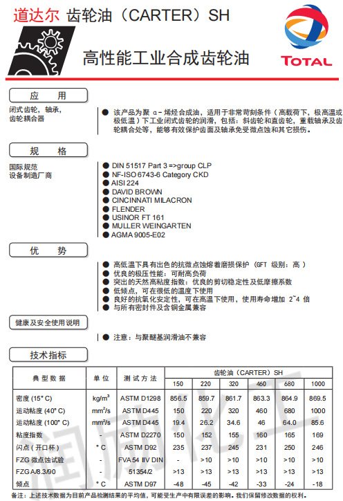 道达尔CARTERSH320合成极压齿轮油极高低温闭式齿轮轴承耦合器
