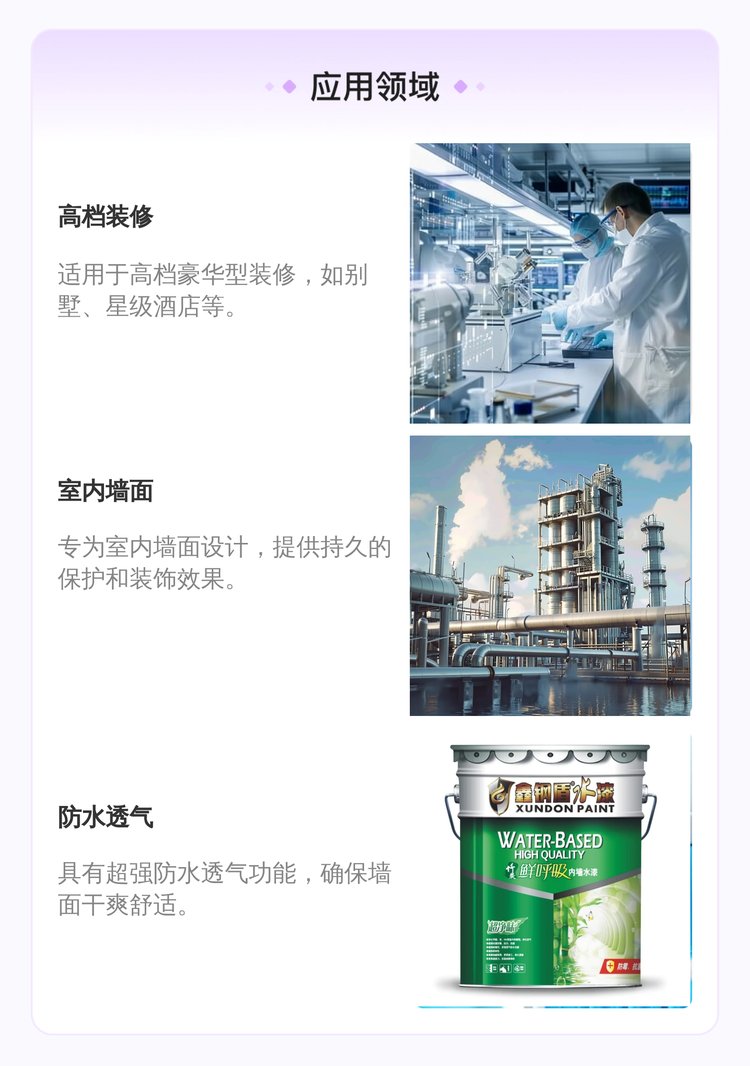产品特点:1、净化甲醛、苯、VOC等室内有害物,净化空气; 2、超强抗菌防霾、抗雾、抗碱; 3、超强耐擦洗,更强透气防水功能; 4、超强柔韧性,漆膜细腻爽滑、更易施工、持久亮丽; 5、更高遮盖力、弥盖细微裂缝