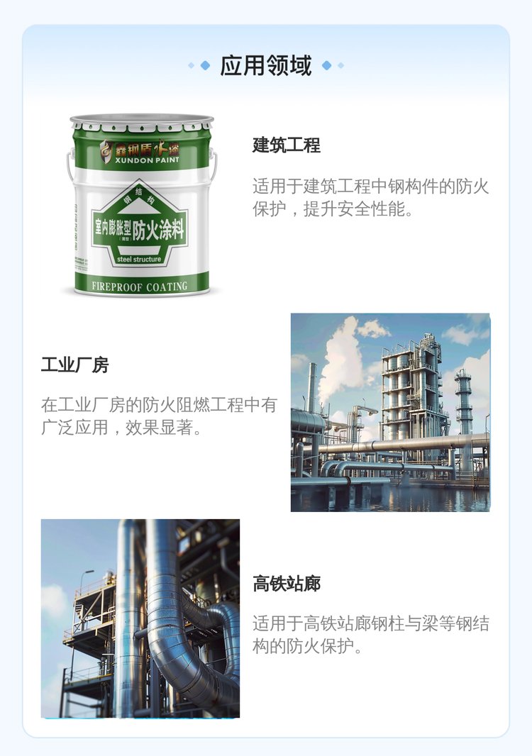 可适用于建筑工程中各种钢构件、球形网架等承重钢结构的防火保护,各类工业厂房、体育馆高铁站廊钢柱与梁等钢结构建筑物的防火阻燃工程中。