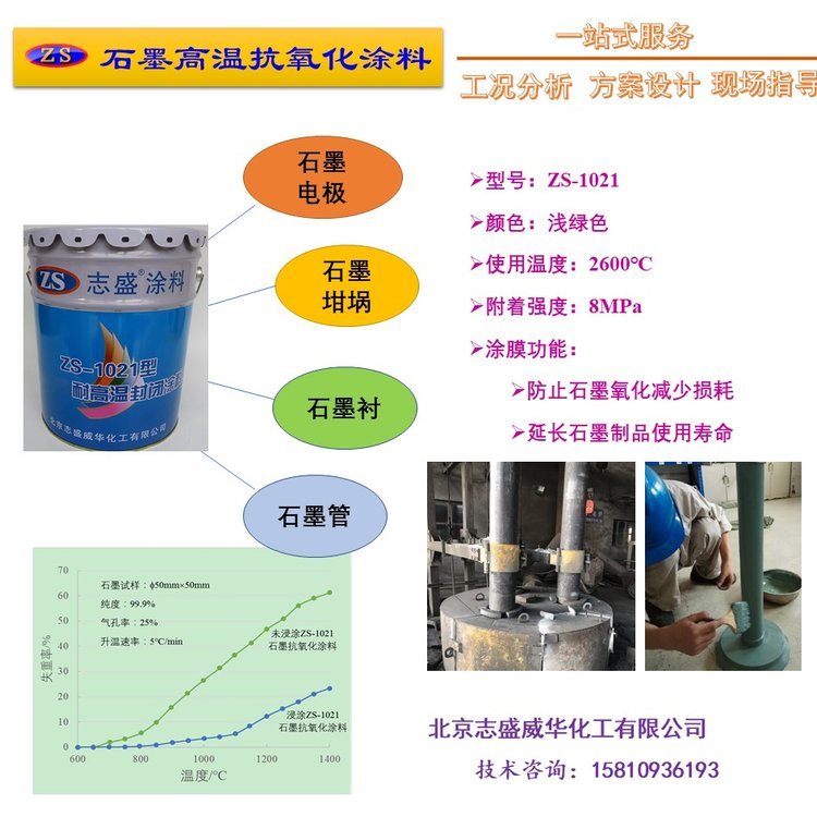?北京志盛威华公司的ZS-1021涂料,耐温到1700℃,直接涂刷在各种碳素产品上,防止碳素设备在高温下氧化,碳素涂料施工方便,耐磨硬度高,耐火耐高温,可以大大延长碳素使用寿命。