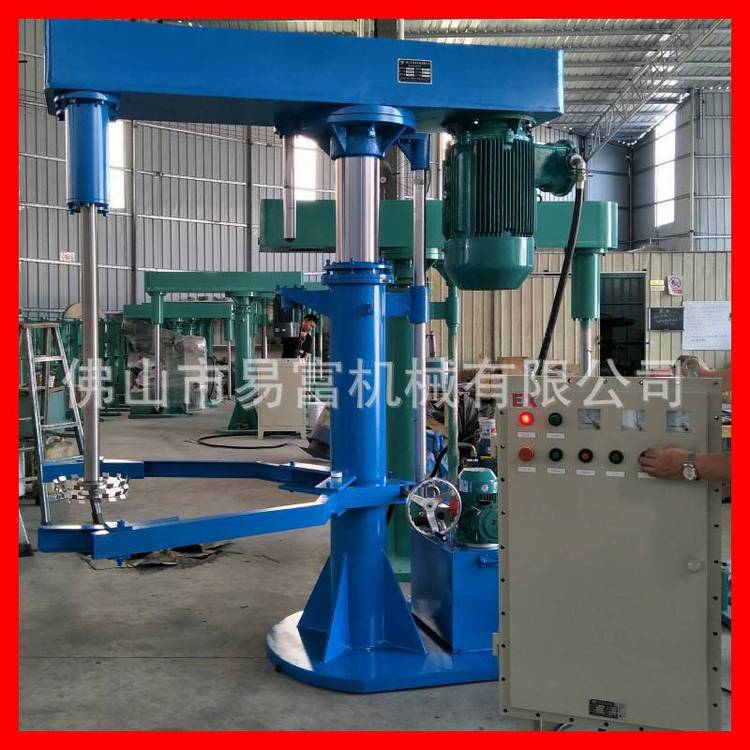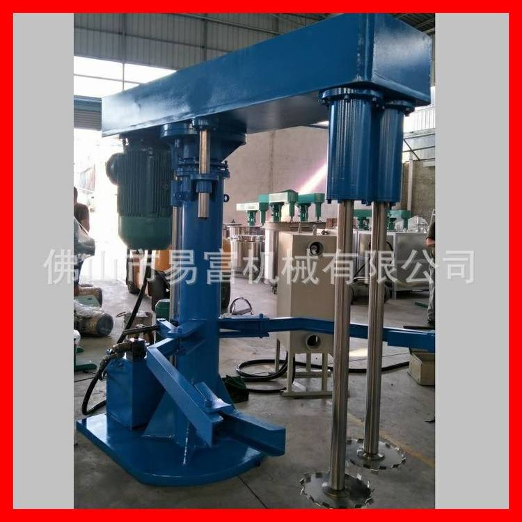 此分散机由机架、轴承座、分散轴、分散轮、油缸、液压站和控制柜等组成。机架升降采用液压传动,升降平稳可靠,机架可以回转360度能一机多筒使用。适应于涂料、燃料、颜料、油墨、造纸、胶粘剂等化工行业对液体及液固相物料进行搅拌、溶解和分散。特点:搅拌、发散时空气吸留少,混合与调匀效果俱佳,用中或高速搅拌、分散可使物料溶解,颗粒变小