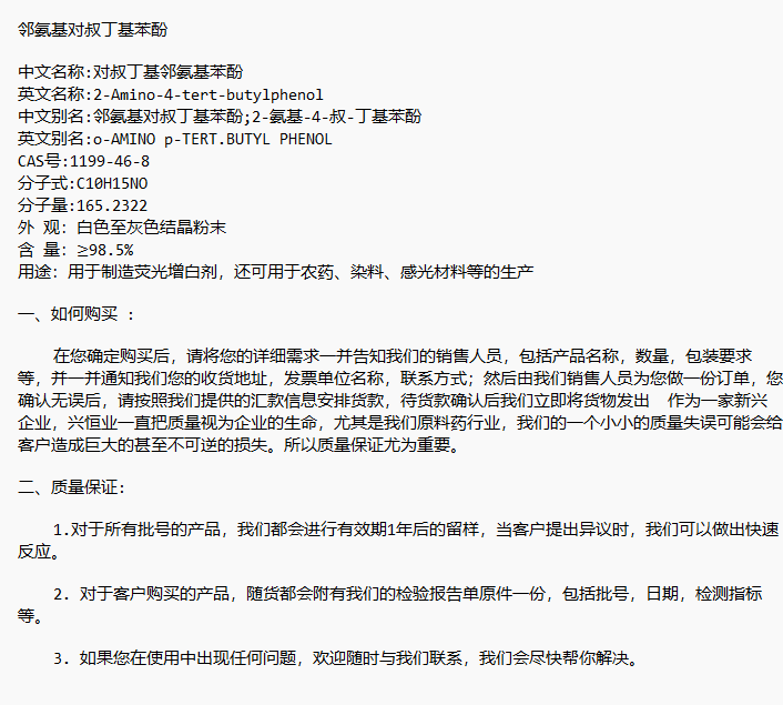 产品名称 | 邻氨基对叔丁基苯酚 | ||