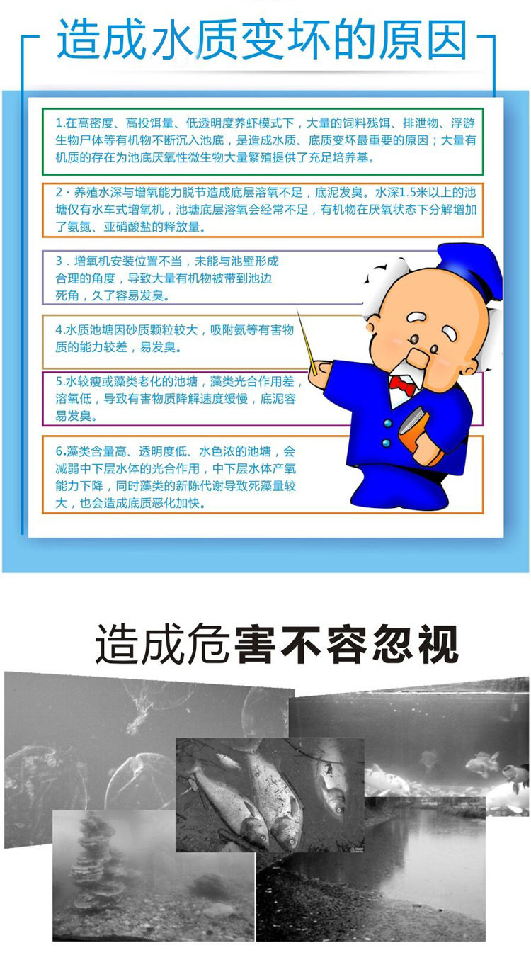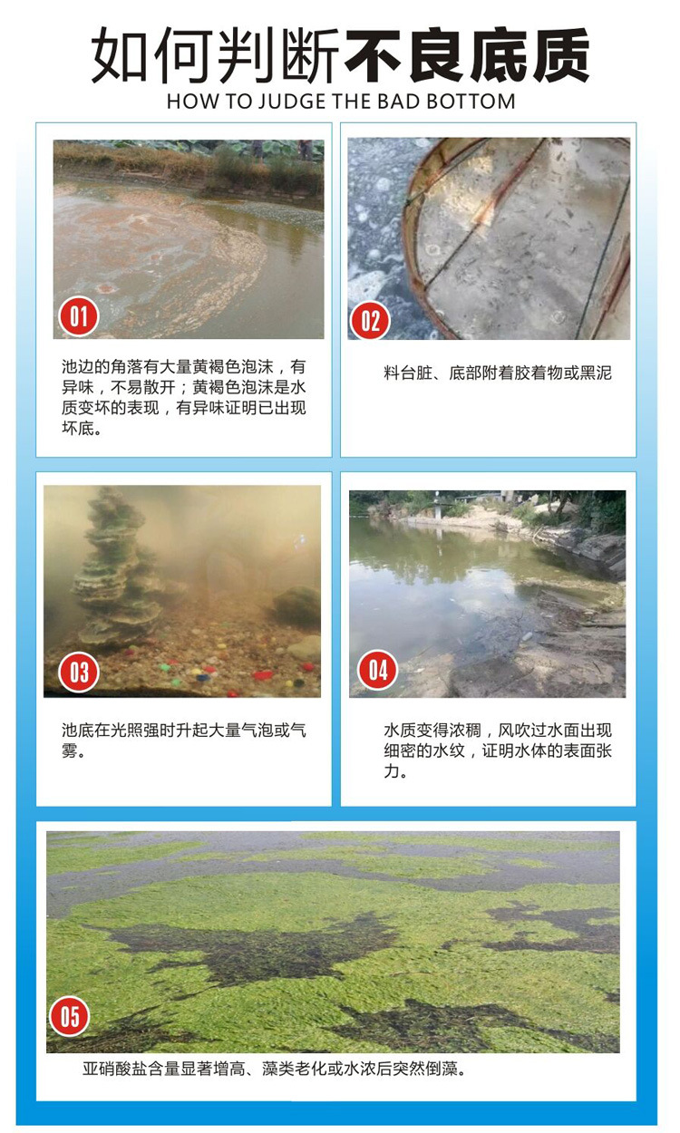 1、所含菌株具有高效降解有机废物的能力。彻底分解水体有机物和底部的粪便、残饵,减少底泥淤积; 2、有效解决养殖过程中出现的老浓水、老绿水、黑水等现象老浓水、老绿水本品单独可解决。解决黑水:本品配合底改菌,连用2天,效果显著。清爽水质,稳定藻相,间接增加底部溶氧; 3、改善饵料系数,提高成活率,提高质量。为养殖动物提供安全、稳定的生长环境; 4、纯度高,火力强,增殖速度快。广盐性,从0度淡水到45度高盐度海水均可繁殖; 5、产酶均衡:蛋白酶、脂肪酶、脂酶、淀粉酶、纤维素酶和木聚糖酶等; 6、低于0.5ppm溶解氧环境下也可以繁殖; 7、低水温环境下也可繁殖; 8、晴雨两用。wqzzbh9896 |