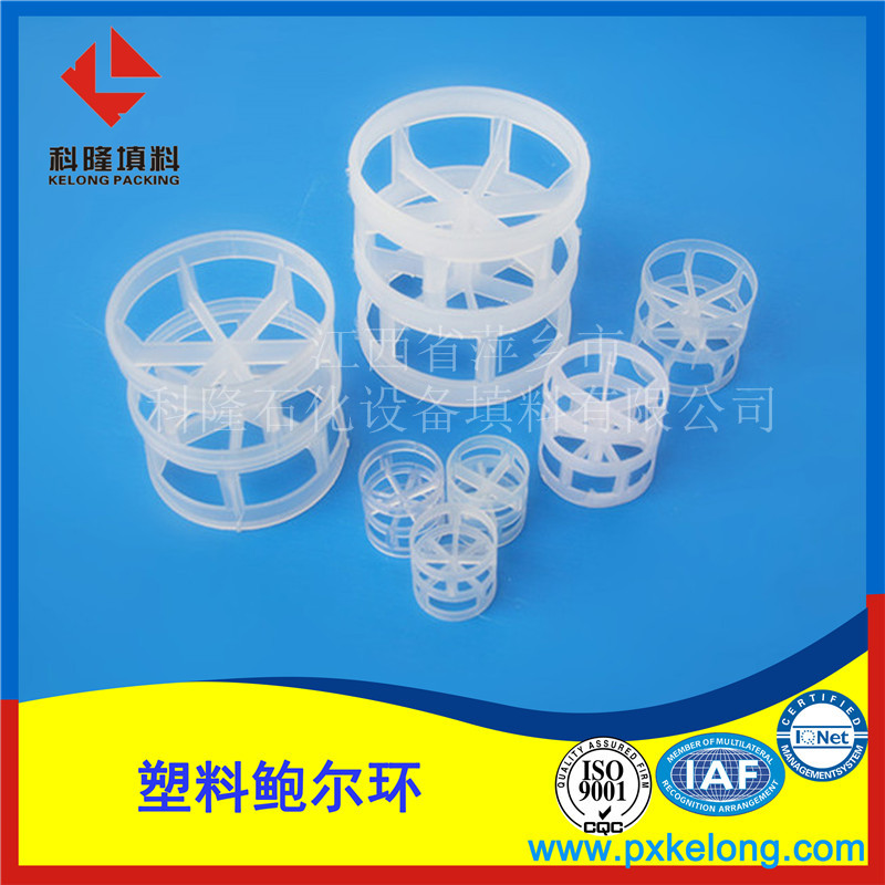 塑料鲍尔环在拉西环的基础上作了重大改进,在环壁上开出两排有内伸舌片的窗孔,这种结构改善了气液分布,充分利用环的内表面,与拉西环相比,处理量可提高50%以上,而压降低一半。