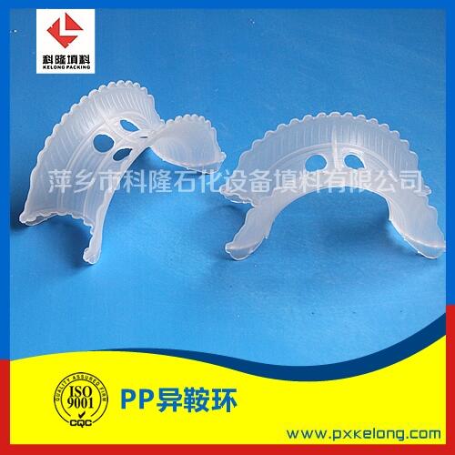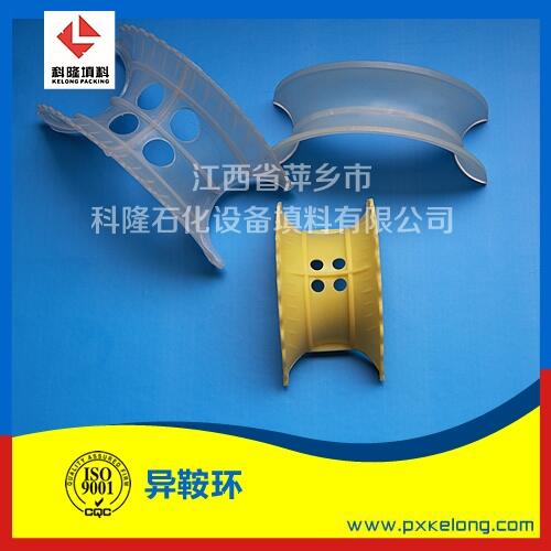 塑料异鞍环填料是对矩鞍环的改进,其特点是将扇形弧面改进成带锯齿边缘的贝壳状弧面,并增加开孔使填料内外表面沟通、增加流体的自由通道,有利于液体分布和表面的更新,故较矩鞍环的处理能力高,压降小、传质性能有所改善。 塑料异鞍环填料类似于马鞍形状,这种填料层中主要为弧形的液体通道,填料层内的空隙较环形填料更加连续,可使气体向上流动时主要沿弧形通道流动。塑料异鞍环填料具有空隙率大,压降和传质单元高度低,泛点高、汽液接触充分、比重小、传质效率高、压降低,通量大,效率高,负荷弹性性大,抗污性好等特点。广泛用于石油、化工、氯碱、煤气、环保等行业的填料塔中。