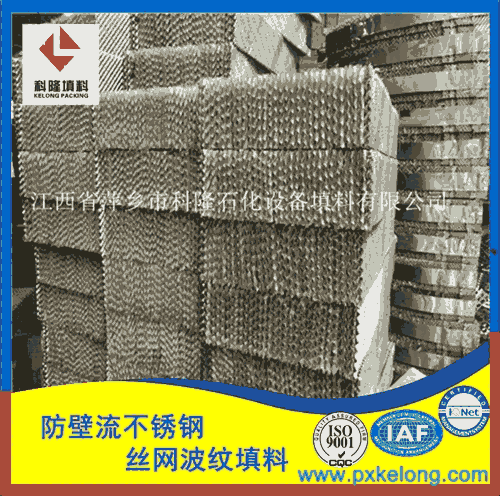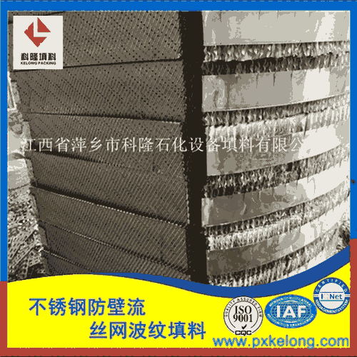 萍乡科隆石化设备填料厂生产的不锈钢丝网波纹填料是由彼此平行、垂直排列的波纹状丝网组成的一种盘状规则填料,每盘填料高度约50-200mm,波纹方向与塔轴倾斜角一般为30°或45°),相邻两片的波纹倾斜方向相反,于是在波纹网片之间构成了一个相互交叉以相互贯通的三角形截面的通道网,组装在一起的网片周围用带状丝网圈箍住,构成一个圆柱形的填料盘,填料盘的直径略小于塔的内径(2mm左右),以便于装入塔内。填料装填入塔时,上下两盘填料的网片方向成90°,填料在塔内构成均匀的几何图形排列,规定了汽液流路,改善了沟流及壁流现象。