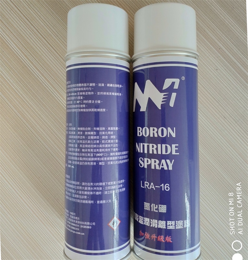 氮化硼涂料喷剂使用范围:适用于高温保护,高温润滑,高温情况下脱模,离型,抗氧化,金属焊接防焊涂布,金属铸造,锻造,挤型工业,铝水包及导流槽保护,真空镀膜机保护剂,电绝缘涂层,高温绝缘体热电偶保护,高温滚轮保护,挤压设备保护,电绝缘体,玻璃工业,耐高温抗氧化涂层,干式润滑介面,耐腐蚀介面,高温烧结坩埚冶具保护与不粘性,金属零件润滑,轴承等高温高磨耗条件下使用。氮化硼涂料(又称:氮化硼耐高温润滑离型涂料)氮化硼涂料是采用优质氮化硼,加特殊配方生产而成,具有极好的润滑性能以及高温稳定性。即使是在超高的温度下,氮化硼依然能保持其润滑性和惰性。常应用于铸造、冲压、锻造和粉末冶金等领域。在金属熔融和金属成形操作过程中,将氮化硼涂料喷涂在与热的或熔融金属接触的模具表面上避免模具化学侵蚀、使脱模,离型更容易、模具/冲模有更长的使用寿命,并大大提高产品的表面洁度,缩短生产时间。