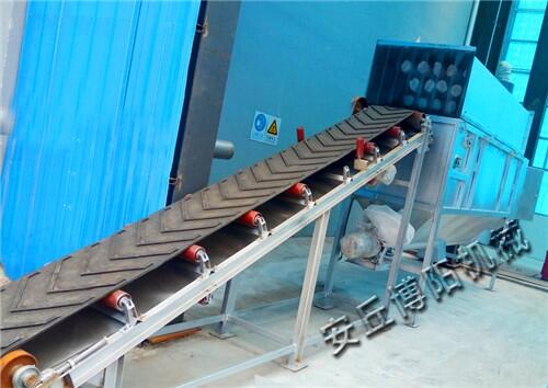 袋装粉粒体物料由皮带输送机传送至45度角的滑板上并依靠重力沿滑板下滑,在下滑过程中由快速转动的铁片将包装袋割开,被割开的残袋和物料滑入滚筒筛进行筛分。从滚筒筛落下的物料由螺旋输送机输出,破损的包装袋、杂质、结块物料被滚筒筛带出机体。割片破袋过程中引起的粉尘由布袋式除尘器捕获并抖落入螺旋输送机(由螺旋输送机输出的物料可通过我公司的管链输送机或者气力输送装置,输送至至物料储罐中)。