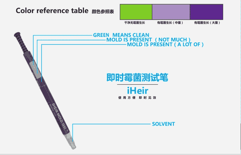 ? 第三步:将棉签放回测试管,用力向下按压手柄,直到棉签卡入下方测试液中,迅速摇晃5 秒,然后等待大约 10 分钟左右,如果溶液变绿,则代表您的产品表面无霉菌,是干净的!如果溶剂变紫,则代表您的产品表面存在大量霉菌正在持续繁殖生长,需做适当的防霉处理。因为这个溶液会寻找霉菌中特定的蛋白质和碳水化合物的存在,使其产生“假阳性”的效果,使其变色。但是需要注意的是,某些物质如食品,血液可能会产生“假阳性”结果,因此在测试前需保证测试材料表面没附着除了材料原生物质外的其他液体等物质。溶剂在使用过后,最终会因为受到细菌的侵袭而会逐渐变紫(24 小时内)。