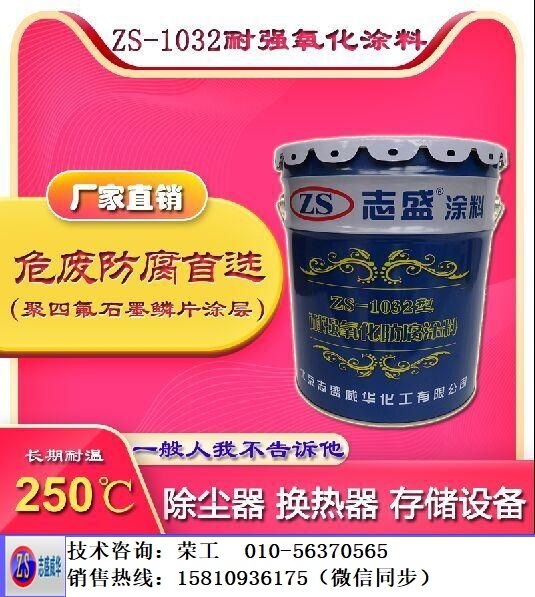 对于烟气成分中含F离子,多氯联苯,硝酸等强腐蚀介质可以采用ZS-1032耐强氧化防腐涂料,该涂料采用聚四氟乙烯、重晶石、鳞片状石墨烯等材料,经高温钝化螯合而成,固化后,惰性高,耐温达到250℃。涂层致密性好,不易失去电子,可耐强酸、强碱。鳞片状石墨烯的规则排列形成层层覆盖,可延长腐蚀介质的渗透路径,使腐蚀介质很难渗透至基材表面,进而起到超强防腐效果。微米级重晶石的化学性质稳定且硬度高,高度分散于聚四氟乙烯网络中,使得涂层在高致密基础上增加了耐磨性。