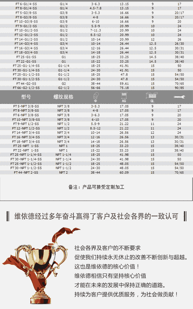 螺牙规格 :共有四种,分别为公制牙MG牙规,德制牙PG牙,美制牙NPT锥螺纹,英制牙G(PF)管螺纹,美制牙为锥螺纹,英制牙为管螺纹型。