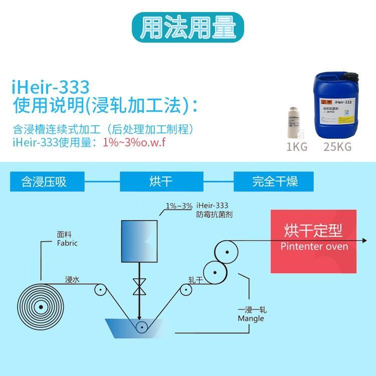 ?一般防霉抗菌防螨布加工:只需将 iHeir-333用纯水稀释后添加于定型槽中即可。EX:欲处理 100KG 布(w.f. 3% iHeir-333), 若压吸率 70%计。即配置 70KG 水溶液
